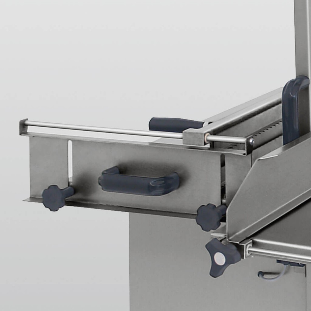 - Empurrador Lateral: Dispositivo manual para empurrar a carne lateralmente contra a guia regulável, e perpendicularmente à serra fita, para corte de peças pequenas ou para finalização do corte da carne;