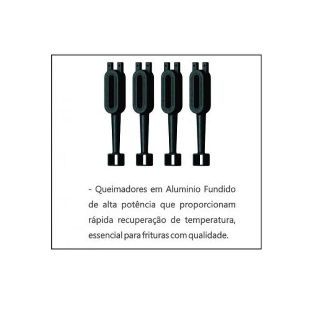 Perfeita para alimentos preparados através de imersão em óleo, nas quais utiliza o próprio óleo como filtro, garantindo assim uma durabilidade maior na vida útil do óleo.A fritadeira Metalcubas é uma união de tecnologia, eficiência e robustez.Para frituras saborosas e sequinhas.Disponíveis em 127V ou 220V Bivolt. Especificações do Produto: Equipamento para Gás em Baixa Pressão.Cestos robustos com cabo isolado. Controlador de temperatura digital garante a precisão na informação e segurança. Termostato de segurança e acendimento automático. Monitoramento contra falta de gás nos queimadores. Queimadores em Alumínio Fundido de alta potência que proporcionam rápida recuperação de temperatura, essencial para frituras com qualidade. Tanque em aço inoxidável 304 para facilitar a limpeza diária. Difusores de calor em aço inox 304, garantem um melhor aproveitamento do calor gerado pelos queimadores. Dados Técnicos: Capacidade Nominal Óleo (Litros): 45 Capacidade por fritura (Kg): até 3 Queimadores: 4 Potência (BTU/H): 120.000 Medidas em Centímetros: Altura: 109 Largura: 56 Profundidade: 80 Peso Líquido (Kg): 63 Área de fritura: 52 x 38 Consumo Gás GLP (Kg/h): 2,45 Tensão (Voltagem): 127 ou 220V Bivolt. Disponivél também na versão GN (Gás Natural). IMPORTANTE: Lembre-se de que alimentos congelados ou com resíduos de gelo em contato com o óleo quente podem causar queimaduras se for manipulado de forma incorreta. |