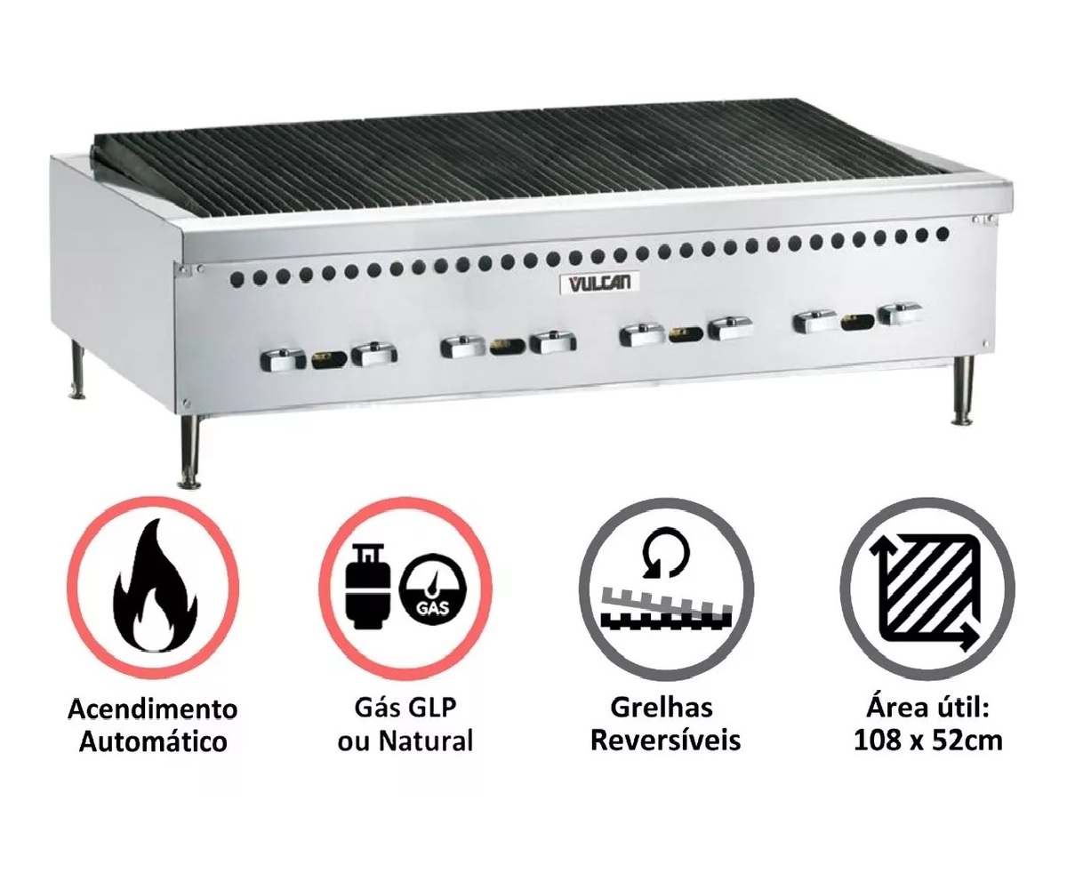 Char Broiler a Gás VCRB-47 Hobart/VulcanDescrição do ProdutoProduto com design inovador e acabamento detalhado, corpo em aço Inoxidável, queimadores em alumínio e grelha em ferro fundido que garante maior durabilidade e robustez. Os Char Broilers Vulcan a gás de bancada são projetados para uso comercial e apresentam rápido e eficiente aquecimento. Cada queimador é controlado por uma válvula de gás ajustável, e os difusores de Ferro Fundido mantêm a temperatura uniforme. Modelo com controles manuais de temperatura por seção e ignição por chama piloto. Possui 8 queimadores de alumínio em formato "I" para ampla cobertura e grelhas radiantes de temperatura construídas em ferro fundido. Atributos do Produto