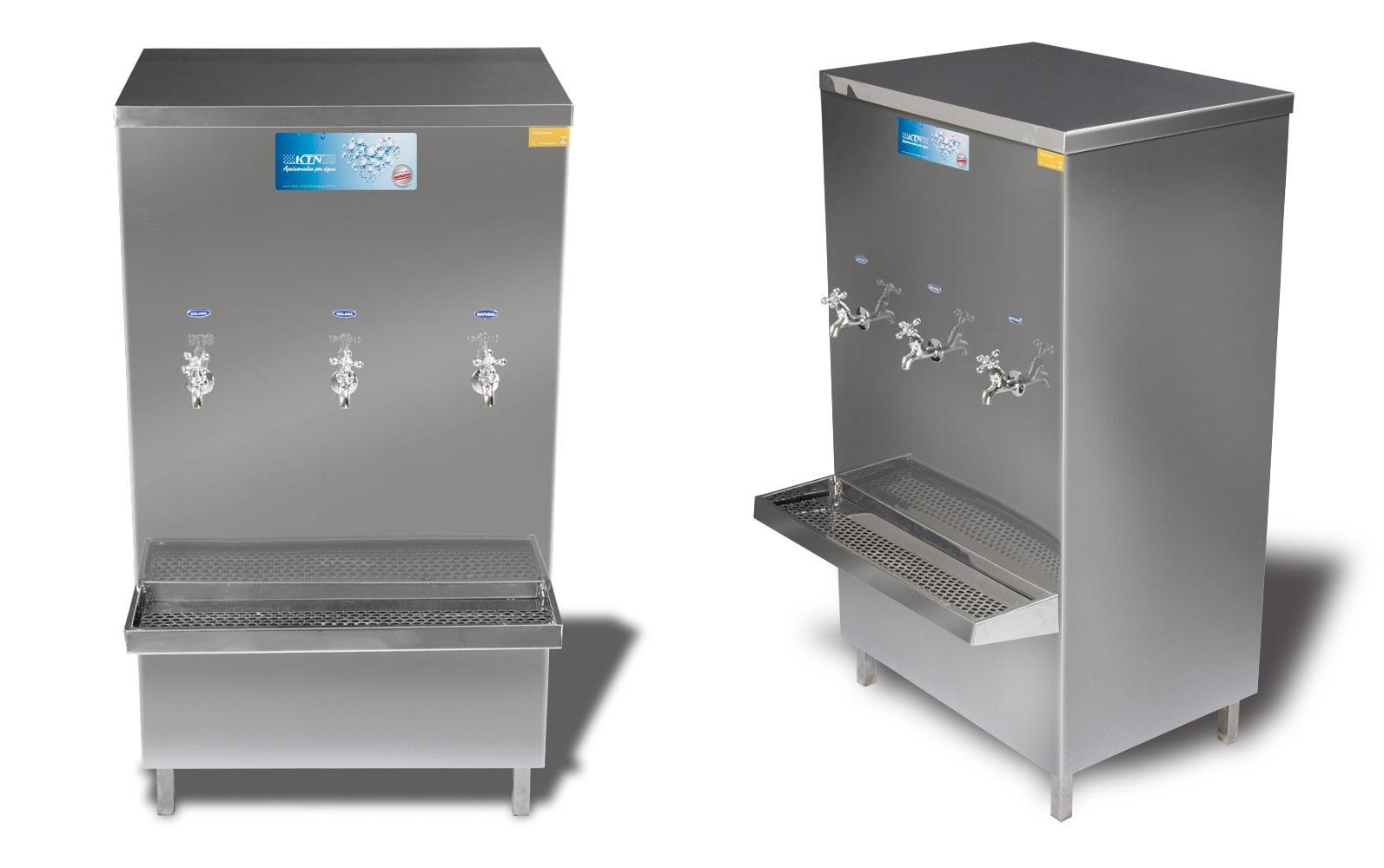 Os Bebedouros Industriais da KTN foram desenvolvidos para serem utilizados em Academias, Obras, Igrejas, Indústrias, Postos de Combustíveis, e atender locais que tenham um intenso fluxo de pessoas. Gabinete: Em aço inox 430. Isolamento: EPS. Reservatório: Fabricado em polietileno. Serpentina: Interna, em aço inox 304. Aparador/cuba: Em aço inox 430. Torneiras: Tipo de pressão, modelo de "rosca". Temperatura: Controle através de termostato com regulagem. Capacidade para 100 litros de água gelada. Flexível/Mangueira para escoamento já embutida. Pode atender, no fluxo, média de até 200 pessoas. Certificado pelo Inmetro. Medidas em Centímetros: Altura: 127 Largura: 70 Comprimento: 70 Peso Liquido (Kg): 36 Tensão: Disponível em 127 ou 220V. Compressor: Embraco 1/6HP. Gás utilizado: R134A (Ecológico)OBS: Acompanha Filtro