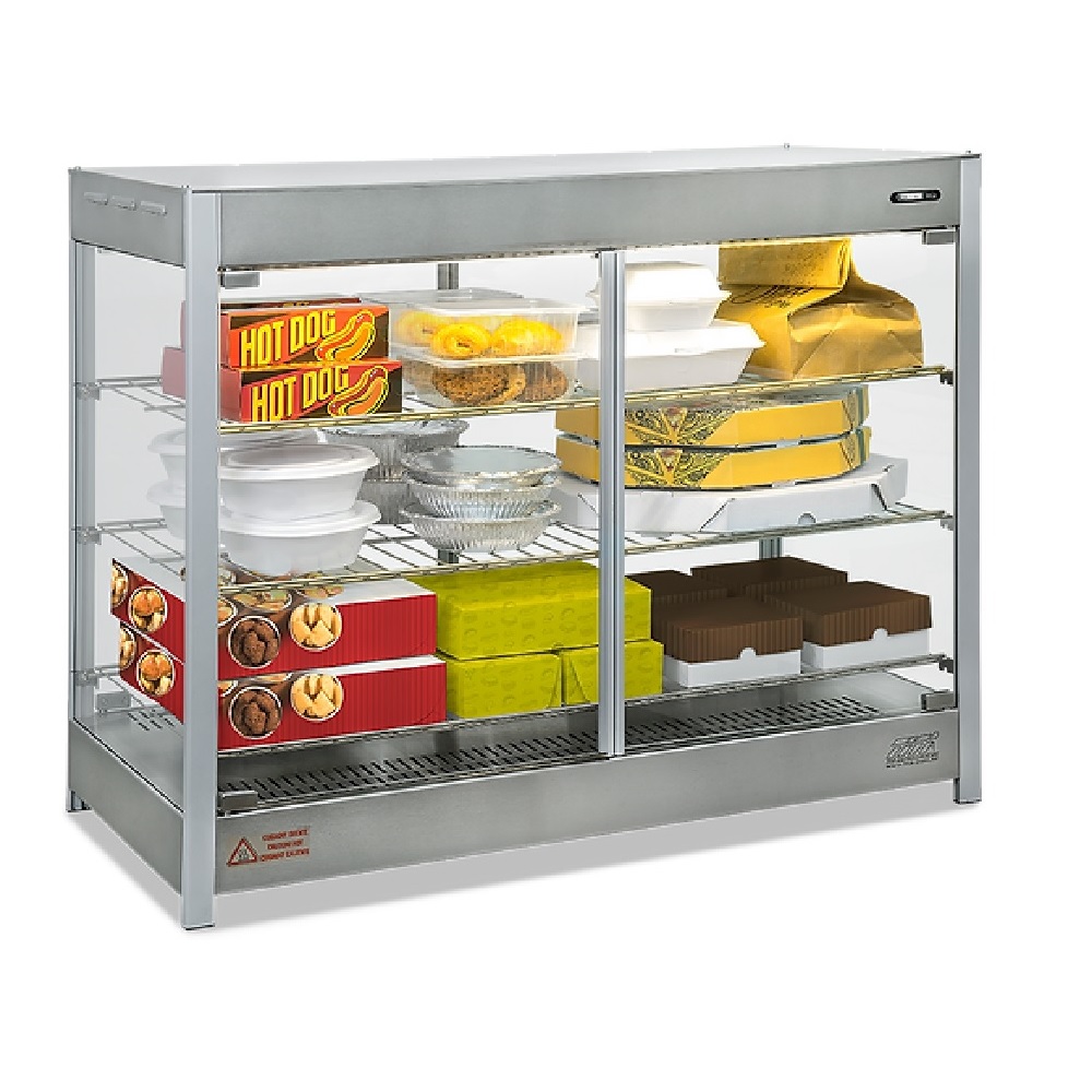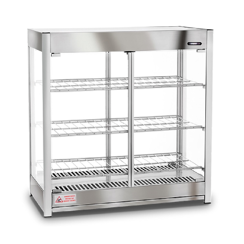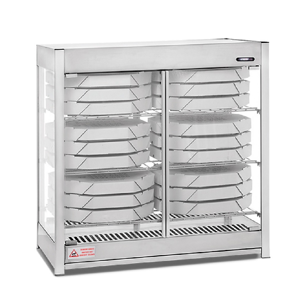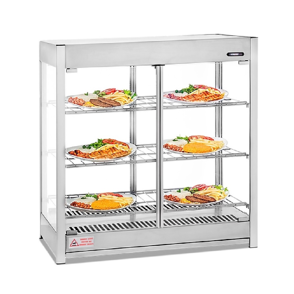 Mantém e conserva os alimentos quentes até servir ao cliente. Trabalhando de forma simples e prática, conserva e mantém pizzas e pratos aquecidos por mais tempo. Com sistema “Pass-Thru”, ideal para restaurantes e pizzarias. Características: Estrutura fabricada em perfil de alumínio anodizado e aço inox; Com todos os vidros temperados; Sistema Pass-Thru,das portas dos dois lados frontal e traseira; 3 prateleira - grelhas em aço carbono niquelado; Termostato para controle de temperatura até 90ºC; Termômetro analógico frontal com indicação da temperatura; Resistência elétrica em aço inox 304 tubular; Recipiente tipo gaveta para adicionar água e gerar umidade; Fiação elétrica com revestimento em silicone resistente a 300º C. Produto com certificação do Inmetro. Dados Técnicos: Capacidade: Até 18 caixas de pizzas de 47cm ou até 72 marmitas nº 9 Potência (Watts): 1500 Frequência (Hertz): 50 - 60 Tensão (Voltagem): Mono 127 ou 220V Consumo (Kw/h): 1,5 Medidas em Centímetros: Comprimento: 100 Largura: 51 Altura: 84 Peso Bruto: (Kg): 42,00