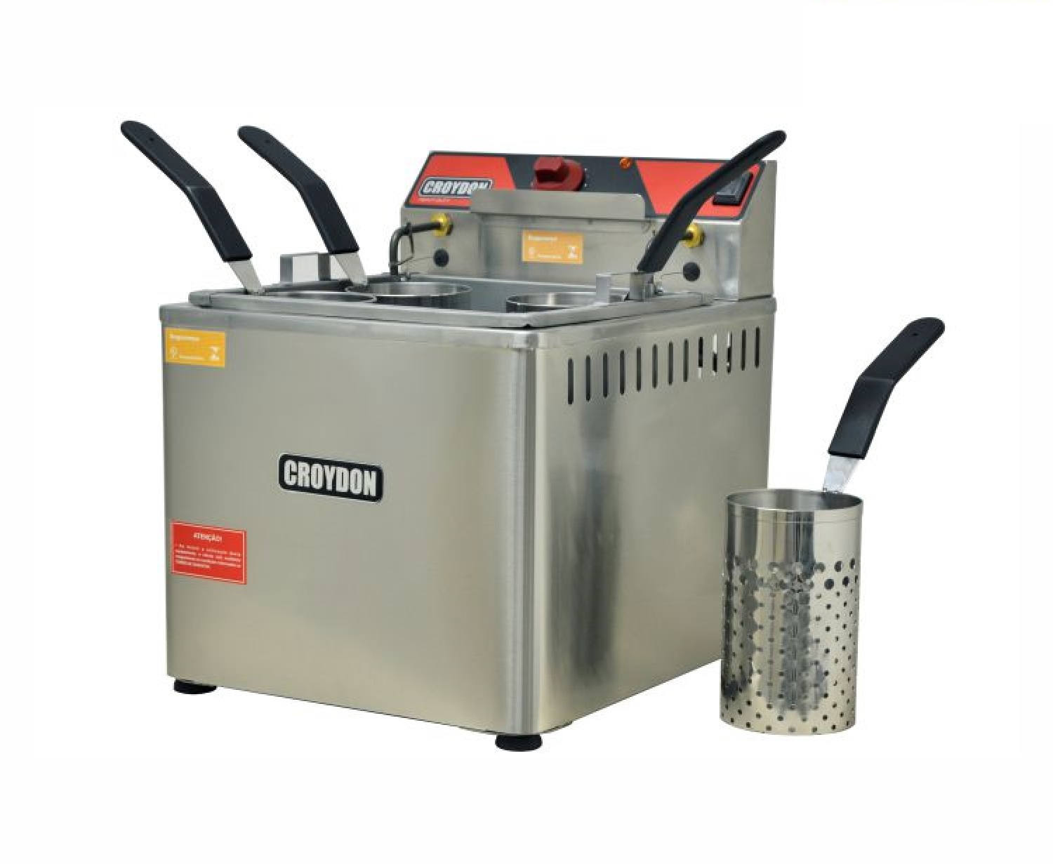 Os Cozedores de Massas foram projetados exclusivamente para a finalidade de cozimento de massas. O reservatório de água e a resistência (com potência de 5000W) são produzidos em aço inoxidável AISI, uma das ligas de aço mais resistentes a corrosão e, por isso, indicada para uso com alimentos. A resistência é comandada por um termostato ajustável, com temperatura máxima de ajuste de 120°C. Características: